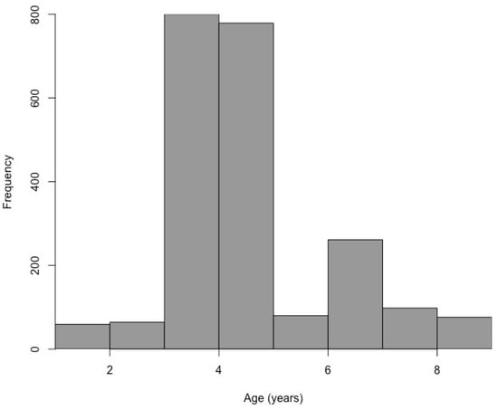 - Bettoli, P.W.; Miranda, L.E. A cautionary note about estimating mean length at age with sub- sampled data. N. Am. J. Fish. Manag. 2001, 21, 425–428. [Google Scholar] [CrossRef]