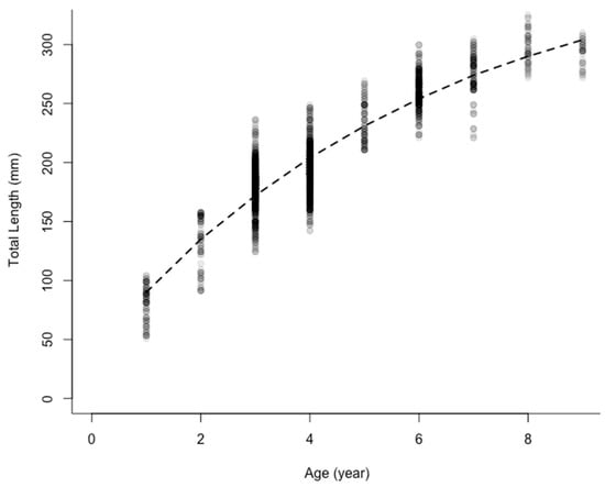 - Quist, M.C.; Pegg, M.A.; De Vries, D.R. Age and Growth. Fisheries Techniques, 3rd ed.; Alexander, A.V., Parrish, D.L., Sutton, T.M., Eds.; American Fisheries Society: Bethesda, MA, USA, 2012; pp. 677–731. [Google Scholar]