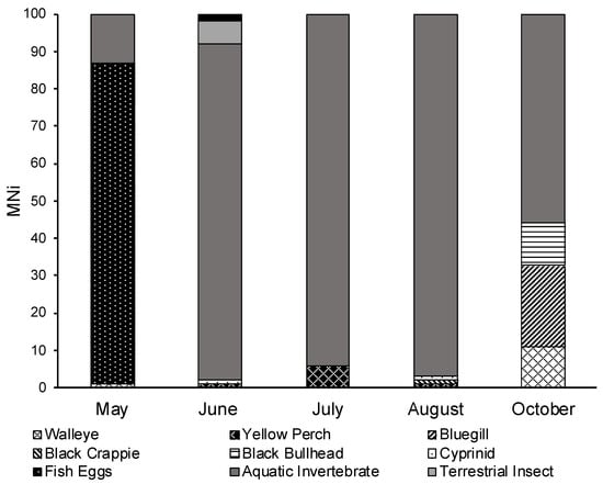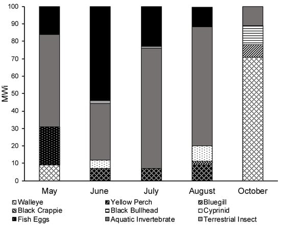 - Clady, M.D. Food Habits of Yellow Perch, Smallmouth Bass and Largemouth Bass in Two Unproductive Lakes in Northern Michigan. Am. Midl. Nat. 1974, 91, 453–459. [Google Scholar] [CrossRef]