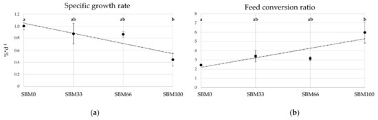Mean values of (a) the specific growth rate SGR (%*d−1, r = 0.69; p = 0.013) and (b) feed conversion ratio FCR (r = 0.669, p = 0.017) for the feeding groups at three different sampling times. Letters (a, b) indicate significant differences between groups (p ≤ 0.05). SBM0 = control, SBM33, SMB66, SBM100 = feeding groups with substitution of fish meal for soybean meal at 33%, 66% or 100%.
