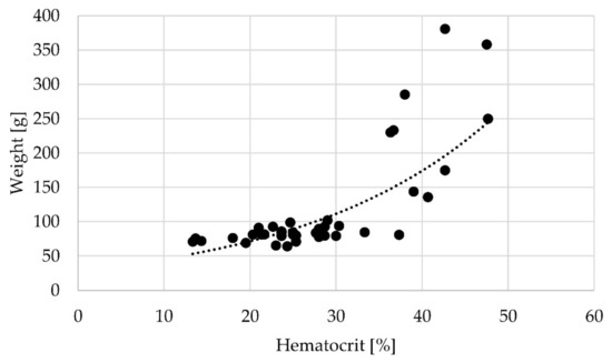 The initial haematocrit value at the start of the experiment (n = 3) was 22.13% ± 3.36%, and the haematocrit values increased with increasing body weight (Pearson correlation; 4 weeks p = 0.003; 8 weeks p = 0.015) (Figure 2).