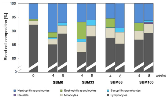 However, we observed a slightly lower percentage of lymphocytes and an associated increase in the percentage of granulocytes and monocytes across the diet groups investigated (SBM0, SBM33, SBM66 and SBM100) after four weeks compared to the start of the trial. The percentage of lymphocytes was slightly higher in the SBM0, SBM33 and SBM100 groups at the end of the experiment (at eight weeks) than at week 4. Trout from group SBM66 had the lowest mean percentage of lymphocytes, which correlated with a decrease in neutrophilic granulocytes, whereas the percentages of monocytes and basophilic granulocytes did not significantly change. Eosinophilic granulocytes were absent in the blood samples at week 8. The occurrence of platelets/thrombocytes (1%) could only be documented in individuals of the SBM100 group at week 8.