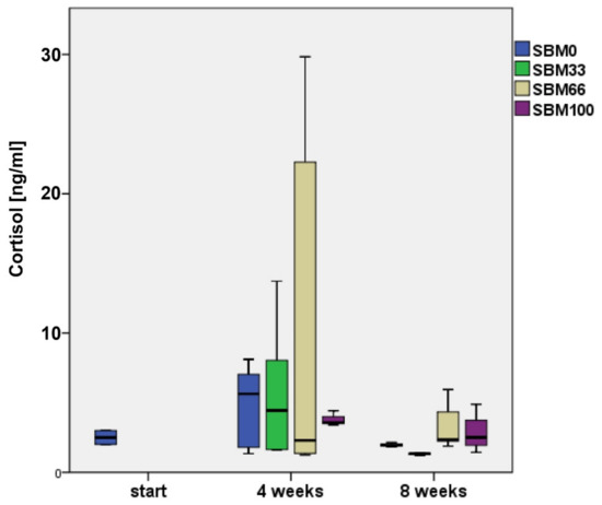 The individual cortisol concentrations showed strong variations; therefore, we did not observe significant differences between the SBM and the control groups. However, a tendency was indicated for a correlation between rising cortisol concentrations and increasing SBM content in the feed (Figure 4). Cortisol level and body weight did not show a significant correlation.
