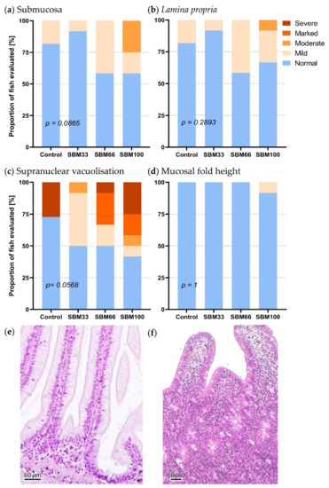 Histological assessment of the intestinal sections from the fish in the feeding trial. The graphs show the number of intestinal sections (n = 6) that were assessed as “normal”, “mild”, “moderate”, “marked” and “severe”. The following morphological characteristics were examined: (a) increase in width and inflammatory cell infiltration into the submucosa, (b) increase in width and inflammatory cell infiltration into the lamina propria, (c) reduction in supranuclear vacuolisation in enterocytes and (d) height of mucosal villi. Histological images represent (e) a normal healthy gut and (f) a gut with severe inflammation characterised by widening and infiltration of the submucosa and lamina propria by inflammatory cells and loss of vacuolisation on the enterocytes. The scale bar represents 60 μm.