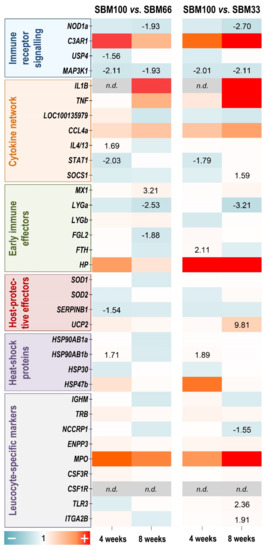 A heatmap illustrating the averaged fold-change values (coloured according to the scale below) of the mRNA concentrations measured in the SBM100 soybean-meal feeding group relative to the SBM66 and the SBM33 groups (both set at 1.0) at the time points indicated. The quantified transcripts are listed as gene symbols on the left and categorised according to their affiliation to immune-related and stress-related processes. Transcripts that were undetectable are marked grey in the appropriate fields. Only significant copy-number changes (p ≤ 0.05) are given.