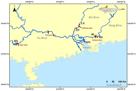 Map of 6 collection sites (red dots) in the three tributaries and estuary of the Pearl River, China. The HX, LX, and HZ are located upstream from dams, defined as upstream populations. Black lines represent dams.