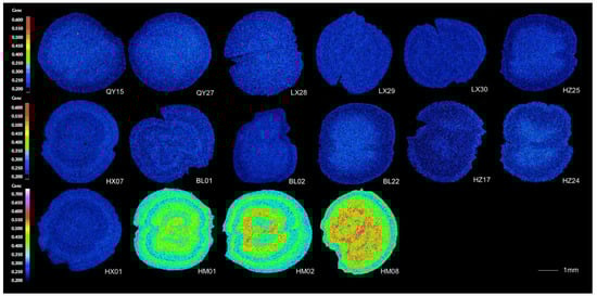 X-ray intensity maps of strontium (Sr) in the sagittal plane of the 16 representative otoliths of Coilia grayii collected from 6 populations; HX, HZ, and LX are located upstream of the dam while QY and BL are located downstream and HM is near the estuary. The uniform bluish pattern indicated a freshwater residence while the yellowish and reddish pattern suggested a brackish water origin.
