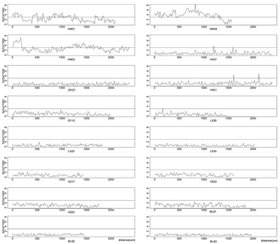 Otolith concentrations of Sr and Ca provide information on habitat and migration patterns over the lifetime of individual fish. The microchemistry analysis of C. grayii revealed two distinct life history types in the overall population: otoliths from all populations, except HM, had bluish areas (low Sr) from the otolith core to the outermost regions on the X-ray intensity map (Figure 2). The mean Sr/Ca ratios from the core to the edge of each otolith were 0.79 ± 0.66, 0.59 ± 0.59, 0.75 ± 0.49, 0.52 ± 0.42, 0.59 ± 0.48, 0.88 ± 0.51, 0.98 ± 0.63, 0.98 ± 0.54, 0.63 ± 0.57, 0.48 ± 0.39, 0.39 ± 0.34, 0.92 ± 0.57, and 0.49 ± 0.43 (mean ± SD) for HX01, HX07, BL01, BL02, BL03, HZ17, HZ24, HZ25, LX28, LX29, LX30, QY15, and QY27, respectively (Figure 3). Low Sr concentrations throughout the otoliths of the populations were consistent with the type exclusively residing in freshwater involving no long-distance migration from a freshwater habitat to a seawater habitat.