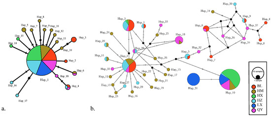 Based on genetic distances, the Neighbor-Net networks within the D-loop exhibited all of the predicted linking haplotypes in C. grayii, and many less frequently occurring haplotypes differed from the abundant haplotype by a single nucleotide, particularly in the HM assemblages, whereas the BL and QY populations had haplotypes with less frequency and multiple mutations, with few haplotypes among the LX and HX populations (Figure 4b). The cyt b network displayed only 18 haplotypes and one distinct dominant haplotype in the whole population, with several low-frequency haplotypes joining the dominant haplotype (Figure 4a).