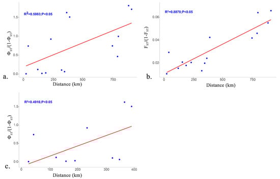 Figure 5 provides plots of pairwise genetic distance vs. geographic distance to distinguish the correlations between genetic distance and geographic distance among the populations based on the D-loop sequences and microsatellite data. The Mantel test showed that the divergence of the C. grayii geographic populations in the Pearl River was consistent with the geographical isolation model (IBD model). The genetic differentiation among populations was positively correlated with the geographical distance of the pairwise populations (R2 = 0.5983, p = 0.0028 **) (Figure 5a) or all six populations, excluding Hengxian (R2 = 0.4916, p = 0.0167 *) (Figure 5c). Furthermore, a strong correlation was detected with the microsatellite data (R2 = 0.8878, p = 0.0056 **) (Figure 5b).