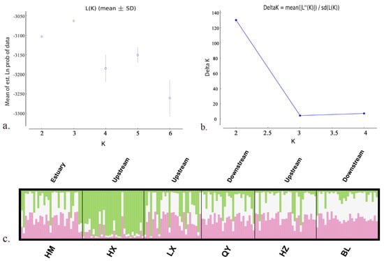 Bayesian clustering analyses based on microsatellite loci using the ΔK method suggested that the best K value was 3 (Figure 6). No distinct genetic structure was observed between up and downstream populations except HX. In three cluster assignments, all individuals from the HX population tended to form a distinct cluster well separated from the rest.