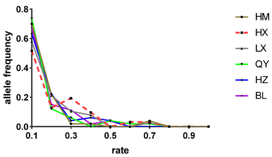 Allele frequency distribution graph of the six populations based on microsatellite markers. A mode shift can be seen in an upstream population (HX), while other populations followed a normal L-shape graph.