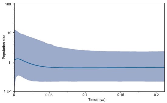 Fu’s Fs-test and Tajima’s D-test based on the mtDNA markers (cyt b and D-loop sequences) yielded negative and non-significant values in the majority of the populations, while the total population results were significant because of the population structure. The significantly negative values manifested an excess of rare haplotypes and low-frequency variants among the populations. We performed an analysis using the BOTTLENECK 1.2 software to test possible deviations in mutation-drift equilibrium. The results were significant (p < 0.050) for the IAM on the Wilcoxon test (Table 5) among three upper-dam populations (HX, LX, and HZ). In part agreement with these findings, the allele frequency distribution pattern of HX was inconsistent with a standard L shape (Figure 7). These results suggested that the populations have recently undergone a colonization and founder effect. Further analysis of the population demographic history is shown by the Bayesian skyline plot of the D-loop sequences—the species has experienced significant expansion in the past 20 thousand years (Figure 8). Thus, the colonization and recent historical population expansion were the main causes of the demographic changes in the overall population.