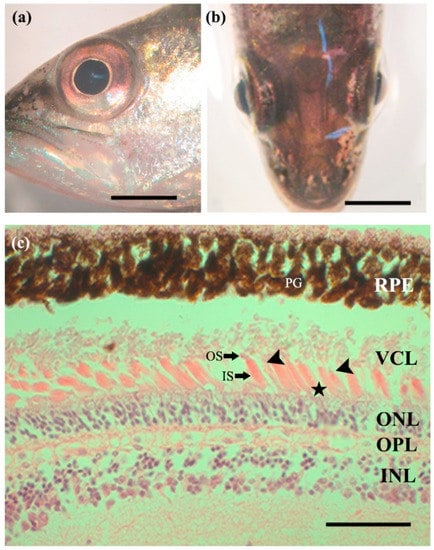 Characteristics of Micropterus salmoides eyes. (a,b) No apparent eyelids and clear, elliptical shape, with the horizontal length longer than the perpendicular length. Scale bars = 5 mm; (c) longitudinal section of the retina, composed of several layers. Single cone (arrowheads), double cone (asterisk), and rod cells, constituting the visual cell layer. Scale bar = 50 µm. INL, inner nuclear layer; IS, inner segment; ONL, outer nuclear; OPL, outer plexiform layer; OS, outer segment; PG, pigment cell; RPE, retinal pigment epithelium; VCL, visual cell layer; asterisk, double cone cells (equal); arrowheads, single cone cells.
