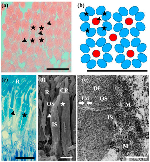 Morphological characteristics of Micropterus salmoides photoreceptor cells. (a) Transverse sections of the retina of an M. salmoides, observed under a light microscope. Scale bar = 20 µm; (b) mosaic pattern arrangement based on (a). The photoreceptor cell has two types of cone cells: equal type double (asterisks) and short single cone cells (arrowheads). As an anatomical unit, the mosaic model confirmed that 5 single (small red circles, arrowhead) and 16 double cone cells (large blue ellipses, asterisks) were arranged per 25 × 20 µm area. Scale bar = 20 µm; (c) longitudinal sections of photoreceptor cells, stained with toluidine blue and observed under a light microscope. Micropterus salmoides photoreceptor cells can be divided into three regions: single cone, double cone, and rod cell (R). Both rods and cones are divided into the inner segment (IS) and outer segments (OS). Scale bar = 20 µm; (d) scanning electron micrograph of photoreceptor cells: the outer segment links to an inner segment by calyceal processes (CP). Scale bar = 3 µm; (e) transmission electron micrograph of photoreceptor cells. The inner segment of photoreceptor cells has numerous mitochondria (M) and the outer segment has a multi-layer disc (DI) structure surrounded by plasma membranes (PM). Scale bar = 1 µm.