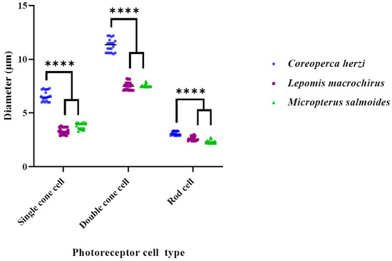 Comparative analysis of photoreceptor cell diameters between three species of predatory fish (Coreoperca herzi, Lepomis macrochirus, and Micropterus salmoides). Values are expressed as means ± standard error of the mean. **** p < 0.0001, when compared with the photoreceptor cell diameter of C. herzi.