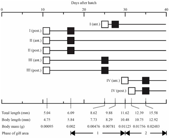 Figure 1. Schematic diagram of gill development in Japanese flounder. Square symbols indicate the first appearance of gill filaments (open black squares) and secondary lamellae (closed black squares) on the anterior (ant.) and posterior (post.) hemibranches of the first (I) to fourth (IV) gill arches.