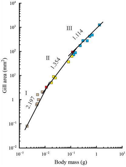Figure 2. Allometric relationship between the gill area (colored squares) and body mass. The values above the regression lines indicate their slopes. The gill area was measured using the triangle method. The ontogenetic phase shifts in the gill area are presented as squares in three colors (gray, phase I; yellow, phase II; blue, phase III). Red-colored squares indicate the gill area measurements that overlap between phases I and II and between phases II and III.