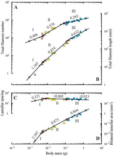 Figure 3. Allometric relationships between body mass and total filament number (colored squares) (A); total filament length (colored triangles) (B); average spacing of the gill secondary lamellae on one side of the filament (colored squares) (C); average bilateral lamellar area (colored triangles) (D). The values above the regression lines indicate their slopes. The ontogenetic phase shifts are presented in three colors (gray, phase I; yellow, phase II; blue, phase III). The red-colored spots indicate the measurements that overlap between phases I and II and between phases II and III.