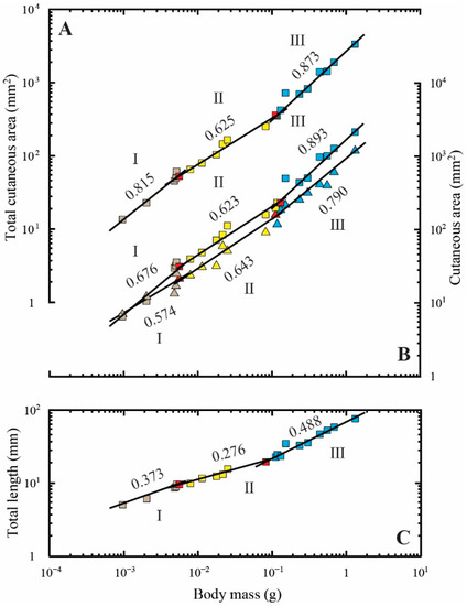 Figure 4. Allometric relationships between the body mass and total cutaneous area (colored squares) (A); body surface area (colored squares) (B); bilateral fin area (colored triangles) (B); total length (colored squares) (C). The values above the regression lines indicate their slopes. The ontogenetic phase shifts are presented in three colors (gray, phase I; yellow, phase II; blue, phase III). The red-colored spots indicate the measurements that overlap between phases I and II and between phases II and III.