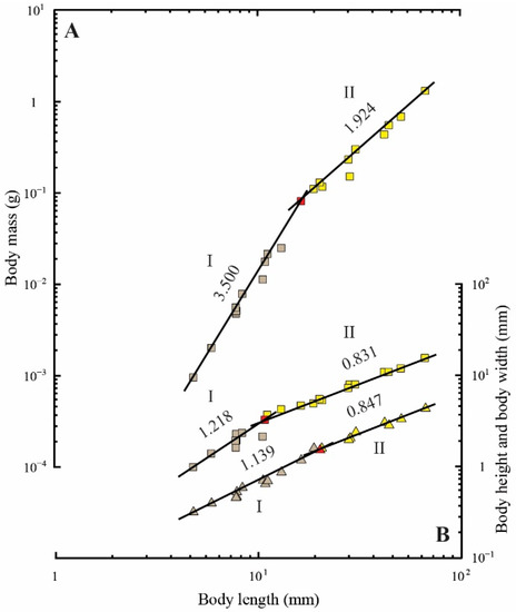 Figure 5. Allometric relationships between the body length and body mass (colored squares) (A); mean body height (colored squares) (B); mean body width (colored triangles) (B). The values above the regression lines indicate their slopes. The ontogenetic phase shifts are presented in two colors (gray, phase I; yellow, phase II). The red-colored spots indicate the measurements that overlap between phases I and II and between phases II and III.