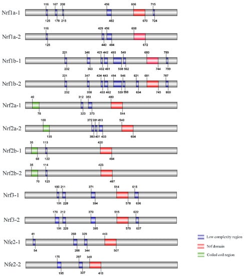 A total of 12 Nrf genes were identified in the common carp genome database, distributed on 11 chromosomes (Table 2), significantly more than the number of Nrf genes in other vertebrates. Among them, human, mouse, clawed frog, coelacanth, tilapia, medaka, channel catfish, stickleback, and fugu had the same number of genes with four Nrf genes, but common carp and zebrafish showed significant amplification of Nrf genes with 12 and 6 Nrf genes, respectively. For gene annotation and nomenclature, 12 common carp Nrf genes were classified based on the similarity of Nrf genes to six known zebrafish Nrf homologs. Duplicated genes were assigned latin word suffixes (-1, -2, etc.). Therefore, the common carp Nrf genes were named as Nrf1a-1, Nrf1a-2, Nrf1b-1, Nrf1b-2, etc. All Nrf gene sequences were uploaded to the NCBI database with MW838195-206 consecutive landing numbers, and the detailed coding sequences, loci, and landing numbers are shown in Table 3.