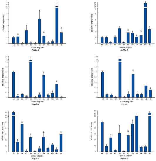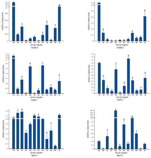 qRT-PCR-based expression analysis of Nrf genes in different tissues of healthy common carp: LR (liver), SK (skin), GL (gill), HT (heart), BD (blood), SN (spleen), KY (kidney), BN (brain), GD (gonad), HD (head kidney), ME (muscle), and IE (intestine).