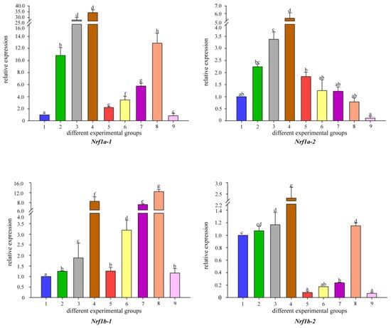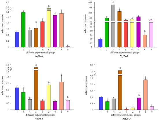 Expression analysis in healthy tissues showed that most Nrf genes were widely expressed and exhibited tissue-specific expression patterns. We observed high expression levels in muscle, blood, brain, liver, and intestine, which are the main accumulation sites of heavy metals in these tissues, such as the intestines as the main organ of digestion and absorption, which is the first interface of the organism to the aqueous environment []. Some of the genes with similar tissue expression patterns, e.g., Nrf1b-1 and Nrf1b-2, have essentially the same tissue expression pattern, which may indicate a similar gene function between the two copies. In addition, we also found differences in expression patterns in different copies of Nrf genes, such as Nrf1a-1/2 and Nfe2-1/2. This may be diverse and assume additional functions through various forms of regulatory evolution, such as divergence in expression patterns []. This also provides evidence for functional differentiation after WGD events.