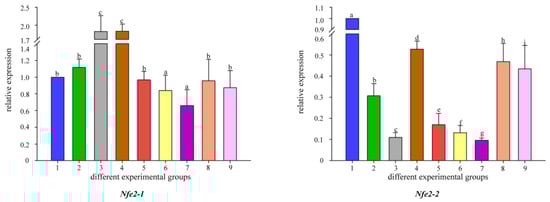 Nuclear factor-E2-related factor (Nrf) belongs to the Cap ‘n’ collar basic leucine zipper (CNC-bZIP) family; it is an important class of regulatory factors that can be involved in oxidative stress response and detoxification of the body []. A total of four members have been recorded in mammals, including Nrf1 (Nfe2l1), Nrf2 (Nfe2l2), Nrf3 (Nfe2l3), and Nfe2, which have close homology to each other [].
