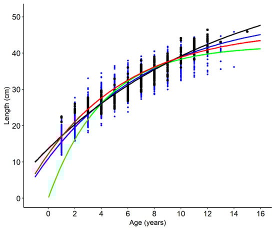 Comparison between the von Bertalanffy growth function estimated by the four approaches applied to length-at-age of Trachurus picturatus from Portuguese continental coast. Black dots are direct readings and blue dots are back-calculated lengths-at-age. Black line—direct readings (DR); green line—direct readings with t0 = 0 (DRfix); red line—back-calculation (BC); blue line—Bayesian inference (DRBayes).