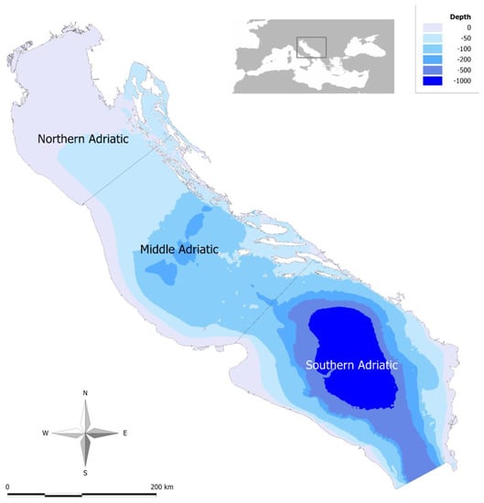 The Adriatic Sea is part of the Mediterranean Sea, occupying only 5.5% of its surface area. This semi-enclosed sea is the northernmost part of the Mediterranean, which influences some important physical properties of the Adriatic Sea. Together with the Gulf of Lion, the Adriatic Sea is the coldest part of the Mediterranean with winter temperatures below 10 °C in its northern part []. The Adriatic Sea is also a shallow sea compared to the rest of the Mediterranean. Three quarters of the sea bottom, about 102,415 km2, is less than 200 m deep []. The depth gradually decreases from south to north []. The Jabuka/Pomo pit (280 m) and the South Adriatic pit (1330 m) are the only areas deeper than 200 m. Therefore, most of the bottoms are on the continental shelf and a significantly smaller part is on the continental slope (>200 m deep). In the south, the Adriatic Sea is separated from the Ionian Sea by the 72 km wide Strait of Otranto [].