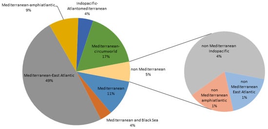 Geographical distribution of fish species was assigned based on distribution Point maps in Froese et al. []. The non-good points as defined in Froese et al. [] and descriptive geographic distributions in the Distribution chapter of Froese et al. [] were not taken into account. Geographic distribution categories are based on the groupings of Realms and Provinces of coastal and shelf areas of Spalding et al. [], covering all expected combinations of the fish species currently known to exist in the Mediterranean Sea. The list of possible categories was first applied to all fish species and then the categories with no fish species in the Mediterranean were excluded, and similar categories with only a few fish species were pooled in order to define a reasonable number of categories in Table 1. Corresponding bathyal and pelagic provinces are only given in Table 1 for each category, for reasons of comparison as the Bathyal provinces of Watling et al. [] and the Pelagic provinces of Spalding et al. [] are much broader and the biogeography is simpler compared to coastal and shelf areas []. Biogeographic boundaries were considered in a strict sense, e.g., a generally Mediterranean species also recorded outside the Strait of Gibraltar was not classified as a Mediterranean endemic species (M), but as a Warm temperate East Atlantic-Mediterranean (WEAM) species, found both in the Mediterranean and Lusitanian provinces. Species assigned to a particular regional category are present in all coastal and shelf provinces listed in that category. In the geographically broad categories, including the worldwide categories, with numerous coastal and shelf realms or with the numerous bathyal and pelagic provinces, the species does not have to be distributed in every listed area in order to fit the category, but all and shelf realms or bathyal and pelagic provinces within the geographic borders of a particular category are listed in Table 1 solely for the purpose of area delimitations.