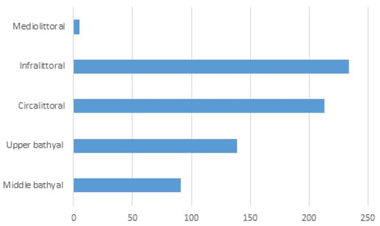 Definitions of marine life environments and of depth zones for pelagic environments were modified from Lally [] (Table 2). Definitions for benthic depth zones were combined from Bellan-Santini et al. [] for benthic littoral and from Emig’s [] revision for benthic bathyal (Table 2). The data for environment and depth range are from Froese et al. []. The entire recorded depth range was taken to define species depth zone.