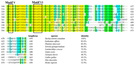 The predicted RcVasa protein contains 8 conserved motifs of the DEAD-box protein family, including motif I (AQTGSGKT), motif Ia (PTRELI), motif Ib (GG), motif II (TPGRL), motif III (DEAD), motif IV (SAT), motif V (RGLD), and motif VI (HRIGRTGR) (Figure 1), and the N-terminal region contains 10 arginine–glycine (RG) repeats and 7 arginine–glycine–glycine (RGG) repeats. The RcVasa protein also has two highly conserved domains, the DEXDc domain (275–486 aa) and the HELICc domain (522–603 aa). Multiple sequence alignment revealed that the deduced amino acid sequence of Rcvasa has 62.6–86.0% identity with those of Rcvasa proteins in other teleosts. The highest identity was found between cobia Rcvasa amino acid sequence and that of the corresponding protein in Seriola quinqueradiata (86.0%), followed by Thunnus thynnus (84.4%), Euthynnus affinis (82.6%), and Larimichthys crocea (79.5%) proteins, while the lowest identity was found with Rcvasa amino acid sequence in Danio rerio (62.6%) as shown in Figure 1.