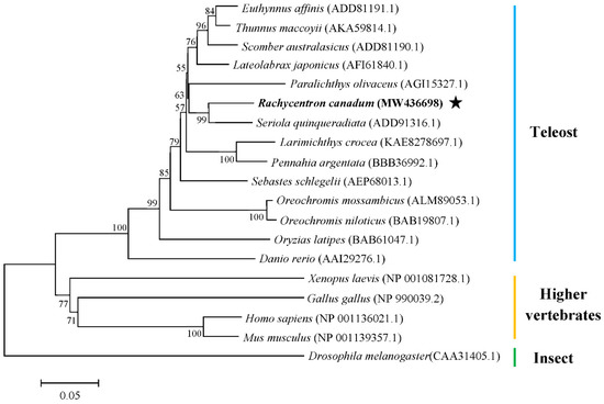 Based on the genetic distances calculated with the Poisson correction model, a phylogenetic tree was constructed by the Neighbor-Joining method to investigate the phylogenetic relationship among different species (Figure 2). The results showed that all the teleost species fall into a lineage, the higher vertebrates, including amphibians, birds, and mammals, fall into another lineage, and Drosophila melanogaster forms a single cluster. The teleost cluster comprises 14 species, 7 of which are from the Perciformes order, 3 from the Scombriformes order, and 1 each from the Pleuronectiformes, Scorpaeniformes, Cyprinodontiformes, and Cypriformes orders. Moreover, RcVasa clusters together with Seriola quinqueradiata Vasa.