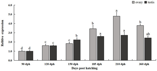 During the first annual ovarian development, the expression levels of Rcvasa first increased and then decreased. The lowest expression level was detected at 90 dph (stage I). The relative expression reached the maximum at 210 dph (stage II), and its value was about 4.97 times that at 90 dph, while the relative expression at 360 dph (stage III) was significantly lower (Figure 4).