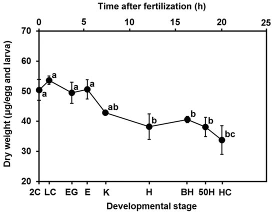 Figure 2 shows the time elapsed at each embryonic stage, 2C, LC, EG, E, K, H, BH, 50H, and HC (0, 1.1, 3.6, 5.3, 7.3, 12.1, 16.3, 18.3, and 20.1 h, respectively); and changes in the dry egg and larval weights were recorded over the course of embryonic development. A hatching rate of >93% was observed. As development progressed, the dry weight per egg and larva gradually decreased.