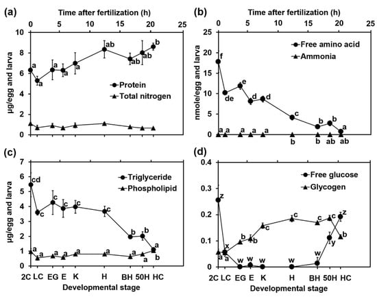 Changes in (a) protein and total nitrogen, (b) free amino acid and ammonia, (c) triglyceride and phospholipid, (d) free glucose and glycogen with the development of yellowfin tuna eggs and larvae. Values are presented as means ± SD. Letters next to values denote significant differences (p < 0.05). Abbreviations are the same as those in Figure 2.