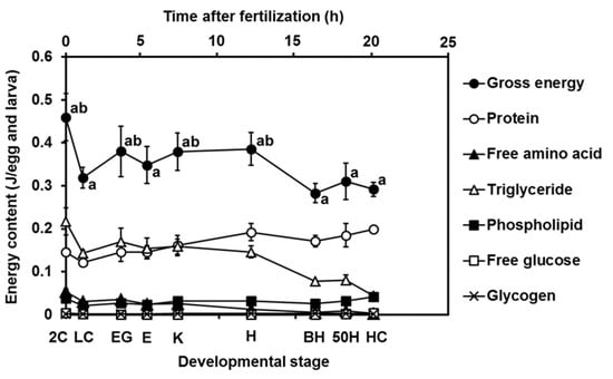 Changes in gross energy contents and energy composition (protein, free amino acid, triglyceride, phospholipid, free glucose, and glycogen) with the development of yellowfin tuna eggs and larvae. Values were calculated using the International Biological Program conversion factors and are presented as means ± SD. Letters next to values denote significant differences (p < 0.05). Abbreviations are the same as those in Figure 2.