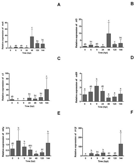 Chicago/Turabian StyleVaz, Mariana, Damiana Pires, Pedro Pires, Marco Simões, Ana Pombo, Paulo Santos, Beatriz do Carmo, Ricardo Passos, Janina Z. Costa, Kim D. Thompson, and et al. 2022. "Early Immune Modulation in European Seabass (Dicentrarchus labrax) Juveniles in Response to Betanodavirus Infection" Fishes 7, no. 2: 63. https://doi.org/10.3390/fishes7020063