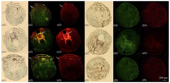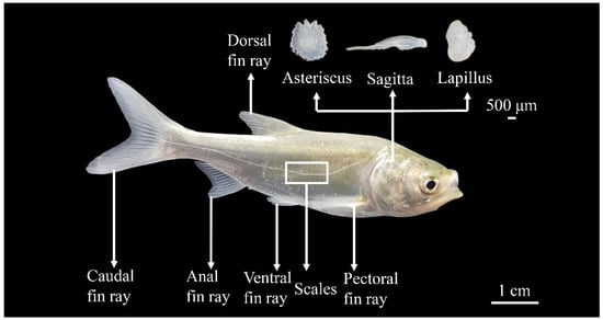 - Lü, H.; Fu, M.; Xi, D.; Yao, W.-Z.; Su, S.-Q.; Wu, Z.-L. Experimental evaluation of using calcein and alizarin red S for immersion marking of bighead carp Aristichthys nobilis (Richardson, 1845) to assess growth and identification of marks in otoliths, scales and fin rays. J. Appl. Ichthyol. 2015, 31, 665–674. [Google Scholar] [CrossRef]