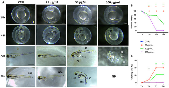 The morphological abnormalities in zebrafish caused by different fotemustine dose exposures (A), survival rate (B), and hatching rate (C). Images were taken from the lateral view under a dissecting microscope (magnification 25). Scale bar, 500 mm. PE—pericardial edema; YSE—Yolk sac edema; SC—scoliosis; DH—delayed hatching; NSA—normal spine axis. *** p < 0.001 versus CTRL.