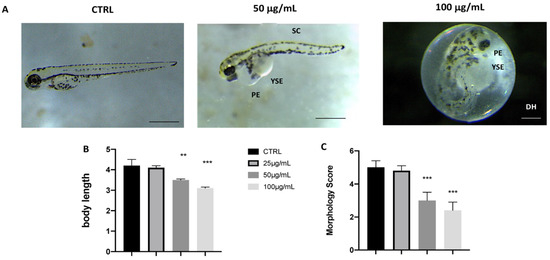 Effects of fotemustine on morphological changes in zebrafish larvae at 72 hpf. Representative lateral views (A), body length (B), and morphological scoring(C) of zebrafish larvae treated with fotemustine 50 µg/mL. *** p < 0.001 versus CTRL; ** p < 0.01 versus CTRL. PE—pericardial edema; YSE—yolk sac edema; SC—scoliosis; DH—delayed hatching. Scale bars 40x magnification.