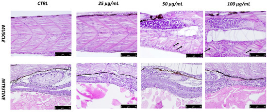 Fotemustine exposure produced noticeable effects in a dose-dependent manner on intestine and muscle tissue at 96 hpf. Indeed, frayed intestinal villi with epithelial desquamation were shown after exposure to fotemustine, a cellular degeneration that could result in increased mucosal secretions, particularly at the concentration of 100 µg/mL, as shown in Figure 3. The 25 µg/mL fotemustine group showed no significant histological alteration compared to the CTRL group, in contrast to the 50 µg/mL fotemustine group, and even more compared to the group with the highest dose of 100 µg/mL. In addition, toxicity was observed at the level of muscle tissue following exposure by fotemustine. Concentrations of 50 µg/mL and, especially, 100 µg/mL showed muscle atrophy along the spine of larvae at 96 hpf (Figure 3), with slight cell degeneration for the highest concentration. Fotemustine at the concentration of 25 µg/mL showed no histological changes in the muscle fibers, showing a very similar situation to the CTRL group (Figure 3). No alterations were seen on the eyes and brain at the different concentrations of fotemustine exposure compared to the control group (data not shown).