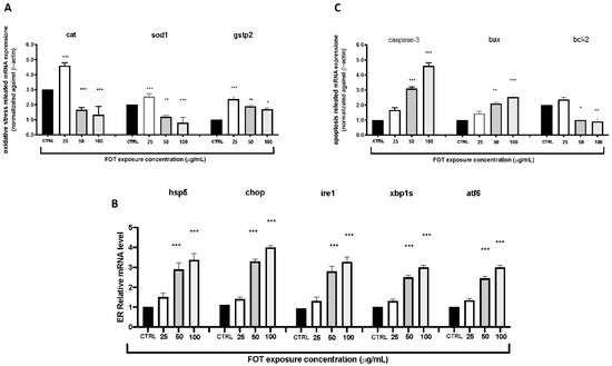 The fotemustine exposure effects on oxidative (A), apoptosis (B), and ER stress (C) pathway-related genes on zebrafish embryos. The results are expressed as mean of three independent experiment data. The expression levels of mRNA are represented as the fold change from the CTRL group. * p < 0.05, ** p < 0.01, *** p < 0.001 versus CTRL.