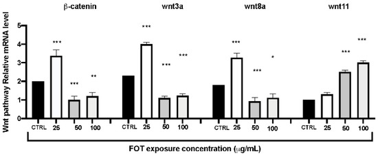 The fotemustine exposure effects on Wnt pathway related genes on zebrafish embryos. The results are expressed as mean of three independent experiment data. The expression levels of mRNA are represented as the fold change from the CTRL group. * p < 0.05, ** p < 0.01, *** p < 0.001 versus CTRL.
