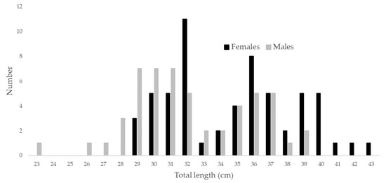 Of the 113 individuals of the European barracuda sampled, 59 (52.2%) were females, 53 (46.9%) were males, and one (0.9%) individual was of indeterminate sex. The sex ratio was not significantly skewed toward females or males (p = 0.57). The total length of females and males ranged from 28.5 to 42.5 cm and from 23.4 to 38.6 cm, respectively (Table 1). A higher proportion of males were smaller than females. Males dominated in the ≤31.0 cm length classes, whereas females were more abundant in the ≥36.0 cm length classes (Figure 1). The Kolmogorov–Smirnov two-sample test showed a significant difference between length frequency distributions of females and males (p < 0.01). The mean length of females (34.6 ± 3.75 cm) was significantly greater than that of males (32.0 ± 3.56 cm) (t-test, df = 1, p < 0.01).