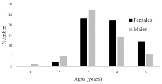 Age distributions of the European barracuda, Sphyraena sphyraena, females and males in the eastern Adriatic.