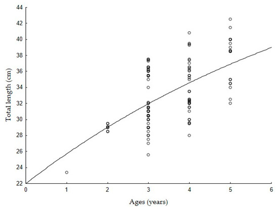 Fitted von Bertalanffy growth curve of the European barracuda, Sphyraena sphyraena, in the eastern Adriatic.