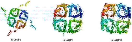 The nucleotide sequences of Sc-AQP1, Sc-AQP8, and Sc-AQP11 were analyzed by using the DNAStar 7.0 software. The protein sequence and the open reading frame (ORF) were predicted by using the ExPASy translation tools (http://www.expasy.ch/, accessed on 1 October 2020.) and ORF Finder (https://www.ncbi.nlm.nih.gov/orffinder/, accessed on 3 October 2020), respectively. The signal peptide and domain were predicted by using the Signal P software (http://www.cbs.dtu.dk/services/Signal%20P, accessed on 15 October 2020) and Simple Modular Architecture Research Tool (http://smart.embl-heidelberg.de/, accessed on 20 December 2020), respectively. The physicochemical characteristics, protein 3D structure, ligand-binding site, and transmembrane helices of the protein sequence were predicted according to the method mentioned in previous research [].